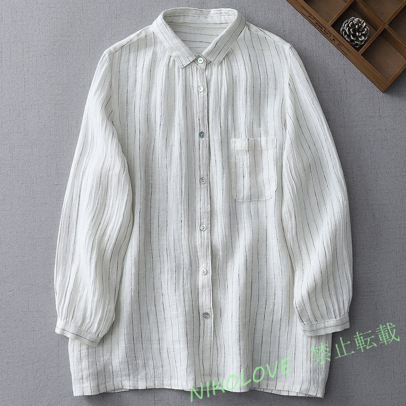 - 新品ゆったり大きいサイズ カジュアル ストライプ柄 ボーダー綿麻ブラウスシャツM~2XL LH002