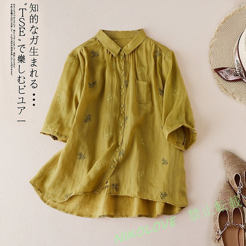 - 新品カジュアル 復古 レディース 花柄 ゆったり大きいサイズ 半袖 着やせ シャツブラウス 緑 LH367