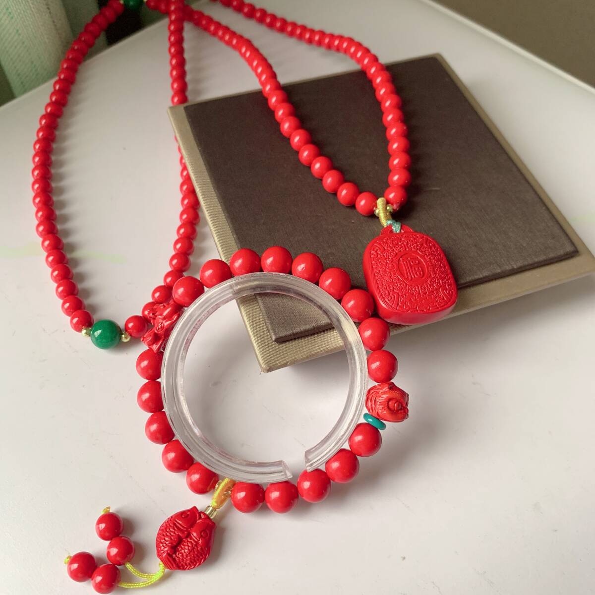 - ◇シナバー(辰砂)+緑玉髄 (クリソプレーズ)3粒◇ネックレス+ブレスレット セット◇巾着袋付き◇プレゼントにも028S60605