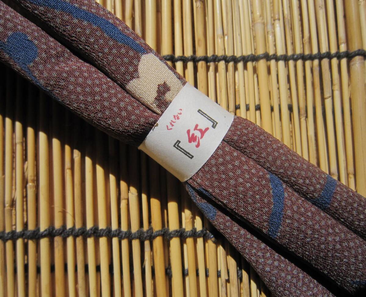 ■正絹アンティーク縮緬。栗茶色に白梅と縹色の染め…から手作りの、丸ぐけ帯締めです。