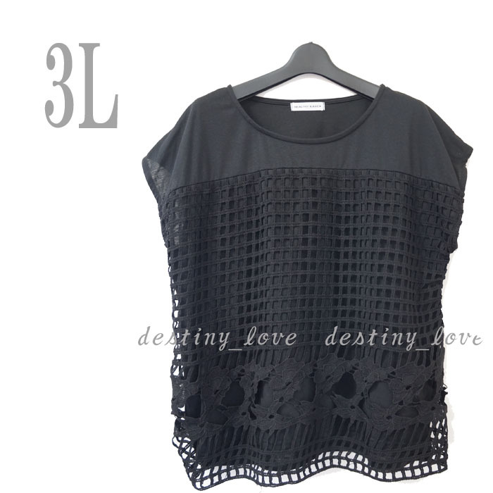 > ●新品/1分袖/チュニック/Tシャツ/黒系/3L/レース編み/チェック/花/大きいサイズ/レディース●f3062