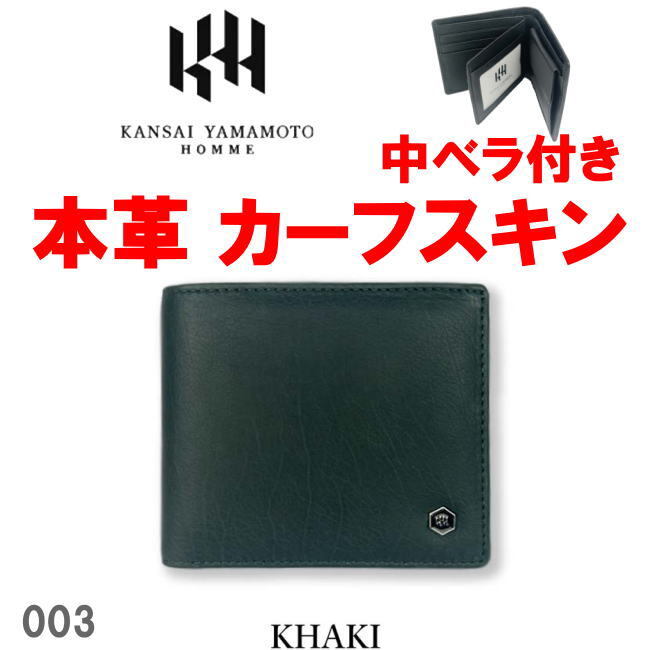 - カーキ 003 ヤマモト カンサイ 中ベラ付き二つ折り財布 本革 カーフスキン