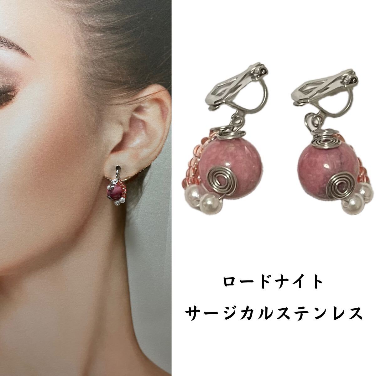 - W94. 天然石 イヤリング ロードナイト ハンドメイド サージカルステンレス アレルギーフリー ニッケルフリー