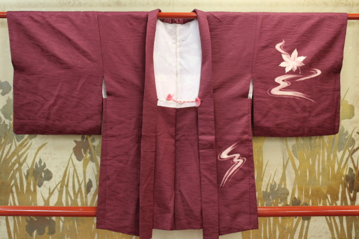 - きもの今昔7265 お羽織コレクション 正絹流水地模様綸子 ワインの濁り色地手描き流水もみじ柄 羽織丈78CM