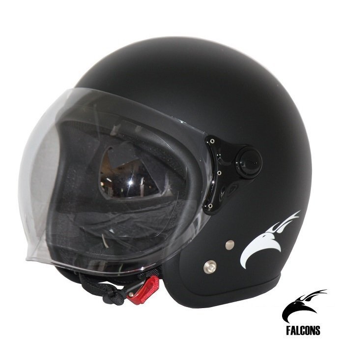 > バイク用品 FALCONS スモールジェットヘルメット マットブラック クリアシールド付 フリーサイズ /顎紐 あごひも ワンタッチ【送料800円】