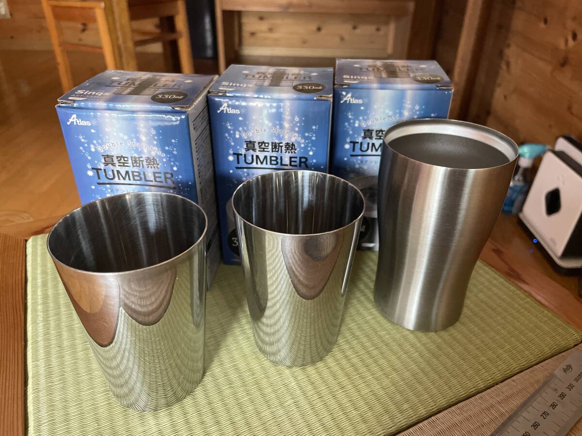 - 真空断熱ステンレスタンブラー未使用箱入り3コ使用品3つ(美品)セットゆうパック着払い夏キャンプギアにも