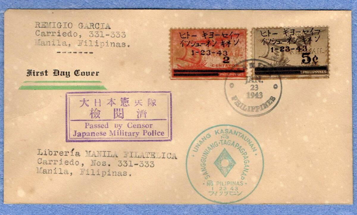 - 南方占領地切手 フィリピン 比島行政府1周年記念 1943年 大日本憲兵隊検閲済 切手2枚 マニラ局 FDC? ヤケ B級品