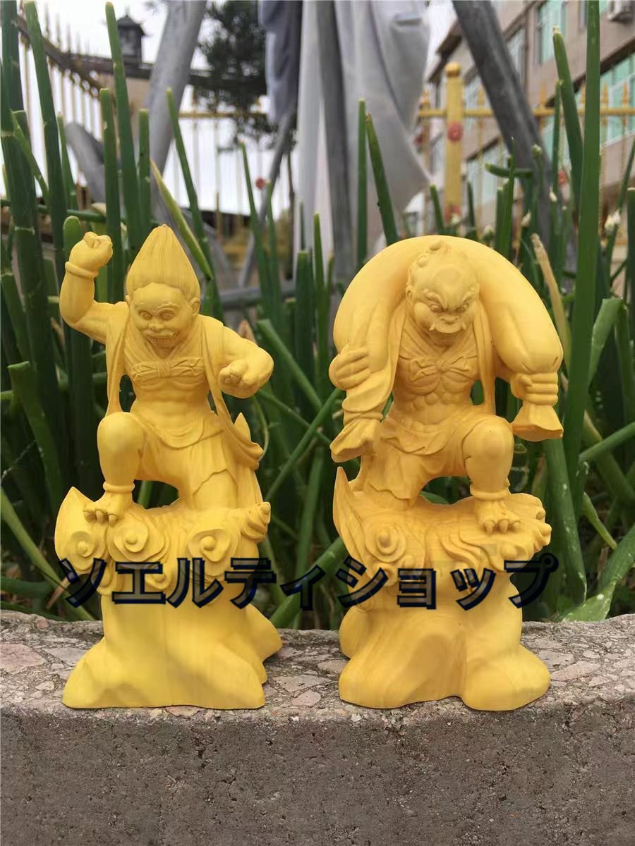 - 上品◆仏像 風神 雷神 木彫り 柘植製 風水 置物 厄除け 開運 高さ12cm