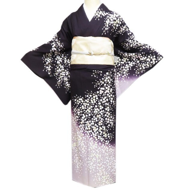 - 特選 訪問着 着物 中古 正絹 袷 フォーマル 金駒刺繍 作家物 落款 花の図 紫黒色 多色 身丈156cm 裄66.5cm M きもの北條 A1070-11
