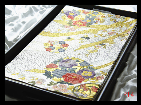 - P14厳選西陣 振袖可 四季花の丸紋 シルバー色地 淑やかに香る気品 六通正絹純金糸高級美術袋帯 ◇検◇簪着物名古屋帯帯締め