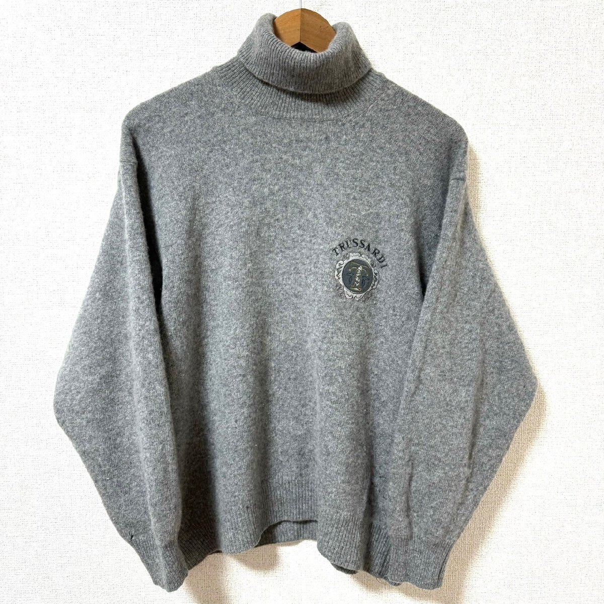 - (^w^)b TRUSSARDI トラサルディ 80s 90s ヴィンテージ タートル ネック ニット セーター ロゴ 刺繍 ワンポイント グレー 4 8355EE