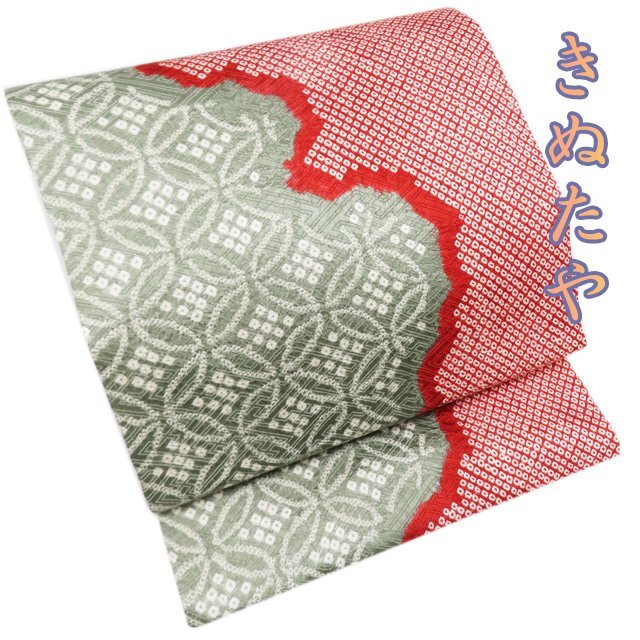 > 特選 名古屋帯 なごや帯 中古 リサイクル 正絹 カジュアル 仕立て上がり きぬたや 鹿の子絞り 七宝 薄青色 赤色 きもの北條 A1077-13