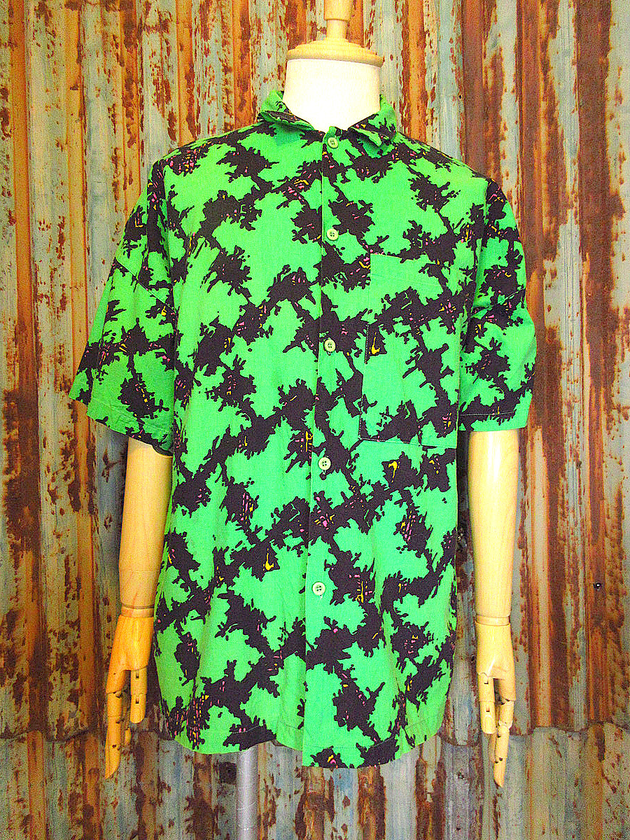 > ビンテージ80’s●Ocean Pacific コットン総柄半袖シャツ黄緑 size M●240822k4-m-sssh-ot 1980sオーシャンパシフィックサーフ古着