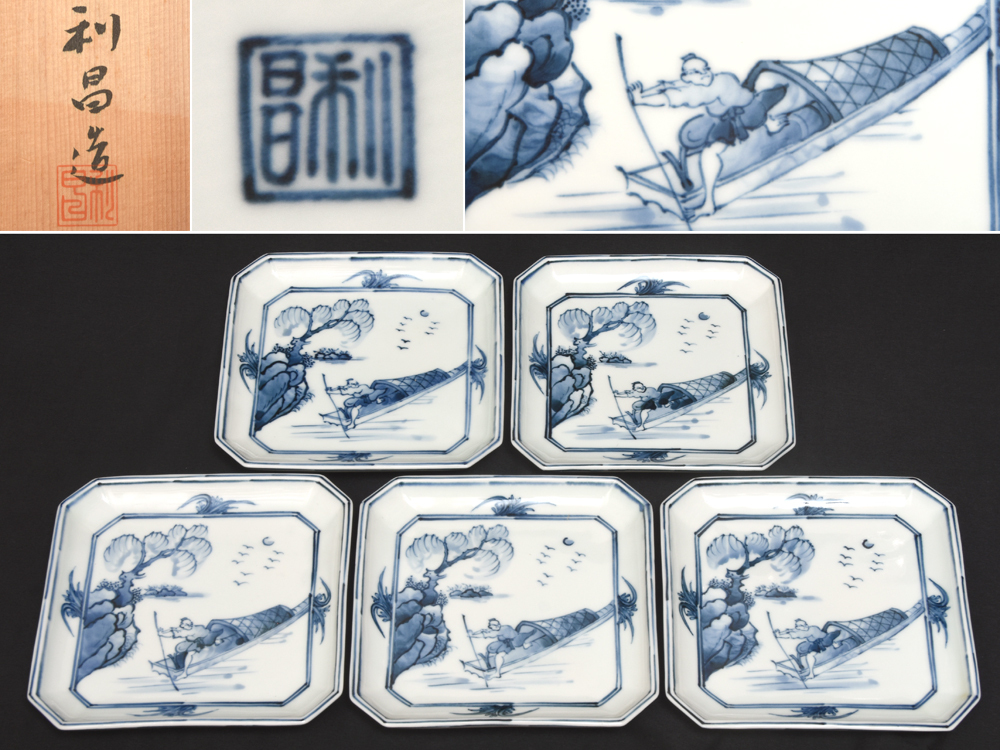 > 平安 利昌(造)染付山水角皿 5客揃い 共箱 幅17.5㎝ 京焼 清水焼 染付 茶道具 会席道具 懐石 和食器 加藤利昌 z7993o