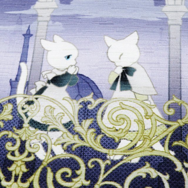 - 特選 半幅帯 未使用 正絹 カジュアル 仕立て上がり 全通 WA・KKA 空中回廊 リバーシブル 猫 薄緑系色 青紫系色 多色 きもの北條 A1080-9