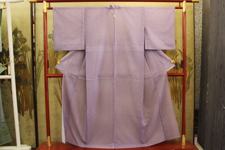 > きもの今昔7494 単衣のきもの 広衿単衣セブセ付き手縫い仕立 合繊駒絽藤色霜降り 未使用に近い 身丈152cm