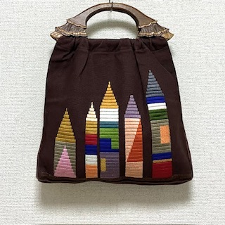 - ★ 即決・送料無料 ★ ウッドハンドル 刺繍バッグ ブラウン 木彫り