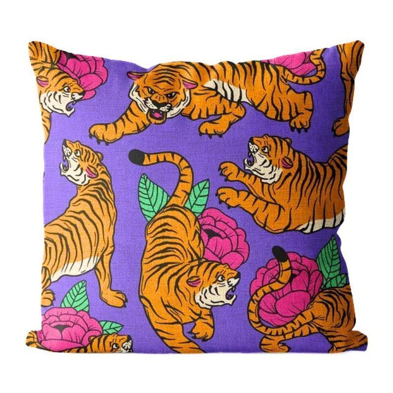 > 虎 タイガー 紫色 クッションカバー 45×45cm おしゃれ 派手 インテリア 正方形 麻生地 リネン 1枚【color 06】