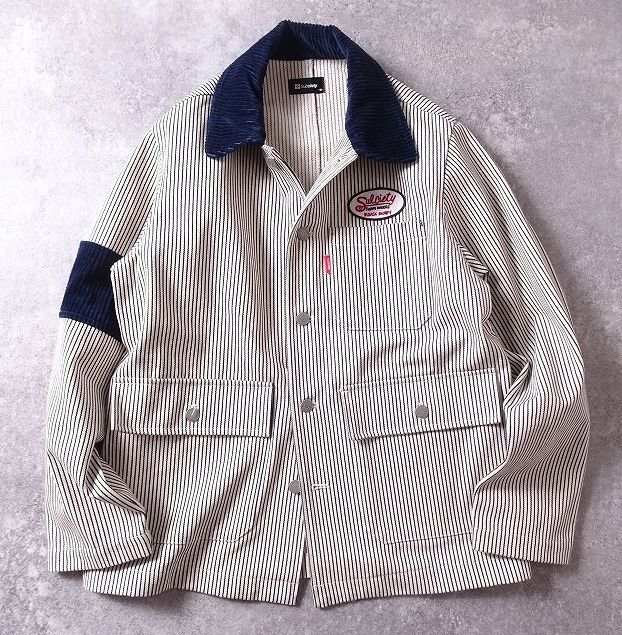 - Subciety サブサエティ 襟コーデュロイ 切替 ヒッコリー デニム ジャケット カバーオール ワッペン ストライプ メンズ (M) ●r-274