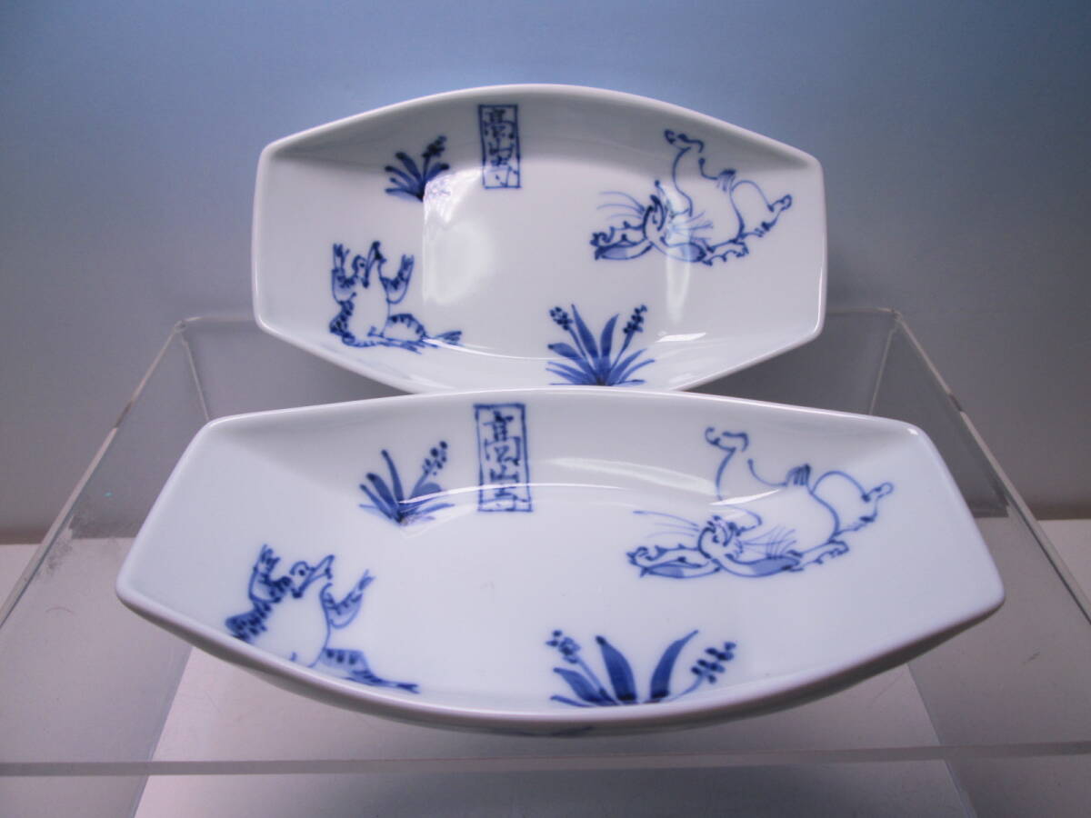 - ☆お料理屋さんの器 在銘 染付 鳥獣戯画文 高山寺 兎と蛙絵 長皿 二客 懐石/割烹/日本料理