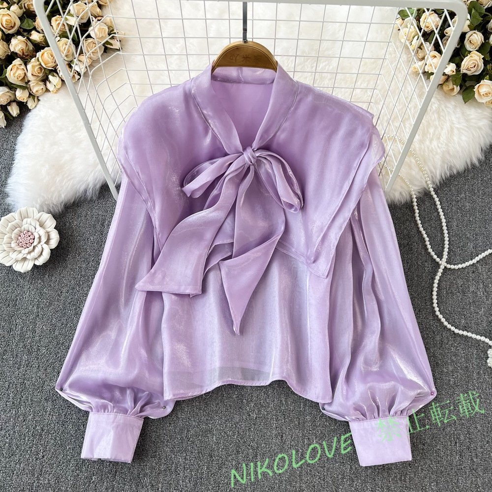 - 新品秋 物 レディースシャツブラウス sexy大人 可愛い 長袖 リボン飾り 紫 LG289