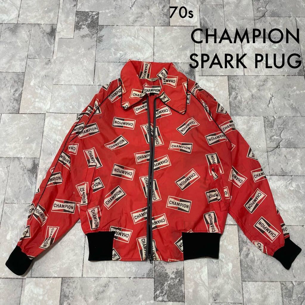 - 70s CHAMPION SPARK PLUG チャンピオンスパークプラグ ヴィンテージ ナイロンジャケット 薄手 総柄 ジップアップ レッド 玉SS2399