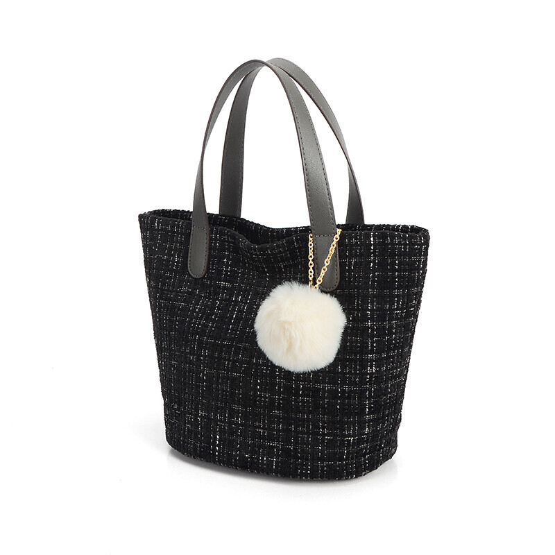 - ツイード素材バケツ型手提げハンドバッグ【マガトVI】ファーチャーム付き/ブラック
