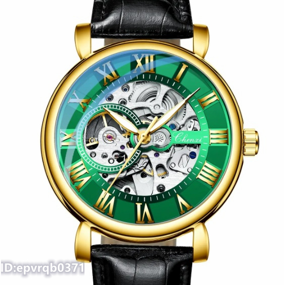 - 男性腕時計 新品 アナログ 機械式自動巻 3針 スケルトン メンズ ウォッチ 夜光表示 防水3ATM 本革ベルト 紳士 通勤 2色選ぶ/グリーン