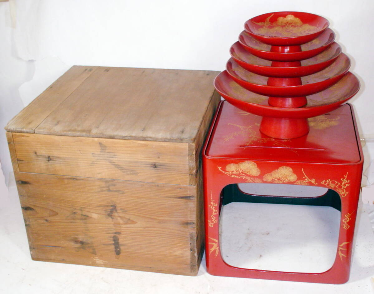 - ちょい古の 5重盃 盃台セット 松竹梅鶴亀の絵
