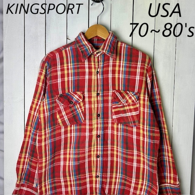 - sh●817 USA古着 70s~80s KINGSPORT チェックヘビーネルシャツ M~L 赤 オールド ヴィンテージ キングスポーツ コットン 長袖 厚手