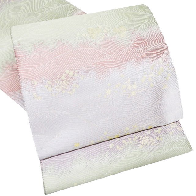 - 袋帯 未使用 正絹 フォーマル 仕立て上がり 六通 波文様 植物文様 箔糸 銀通し 白緑色 薄紅色 白藤色 金 きもの北條 A1089-9