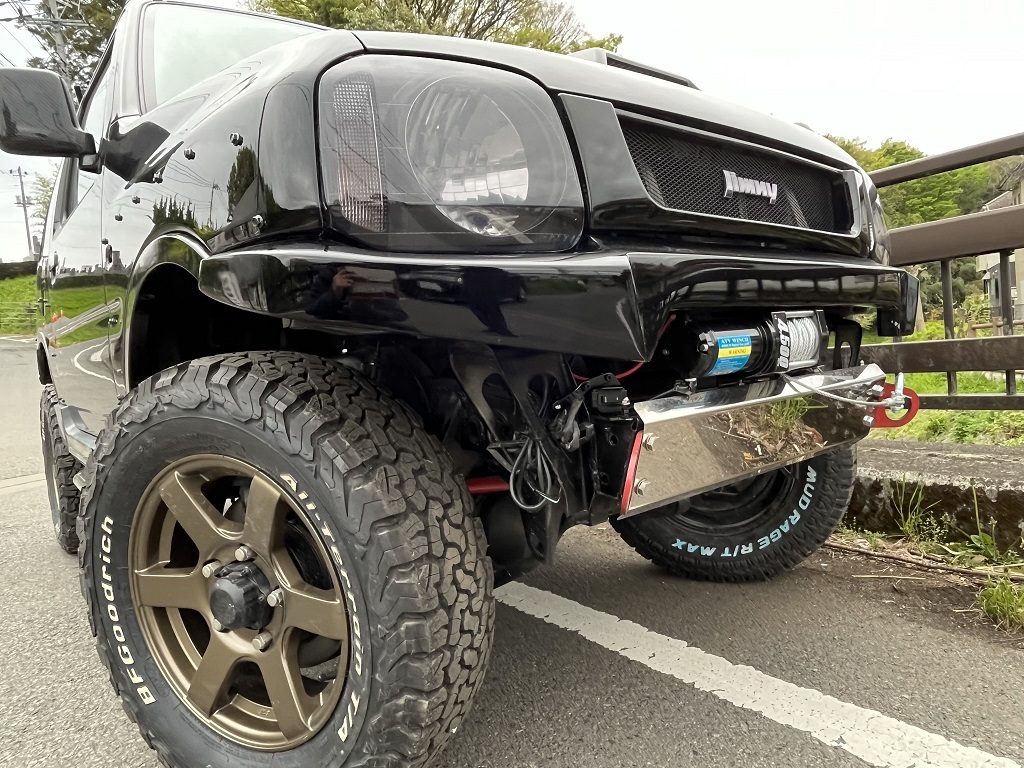 - 塗装済み JB23 ジムニー 切り上げ ショート フロント バンパー FRP 日本製 クラリス ウィンチ 作業灯など 装着向け 23