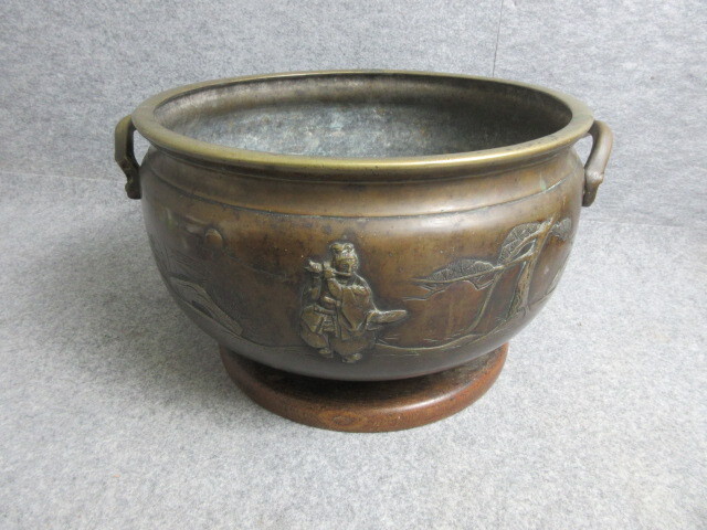 - 【政】33718 宣徳瓶掛 柳に人物 手あぶり火鉢 ひばち 古銅