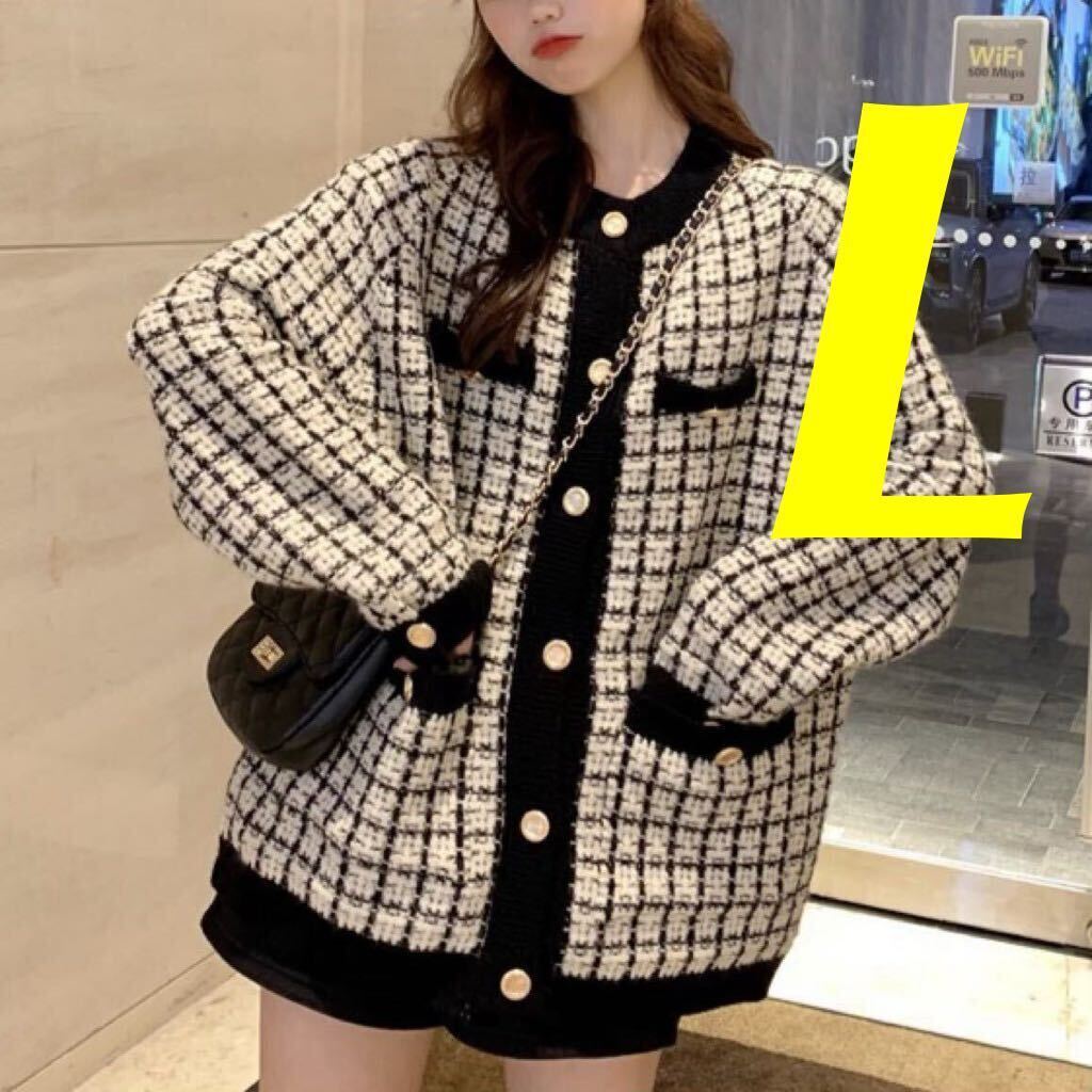 - ジャケット アウター ニットカーディガン ブルゾン チェック ビッグシルエット トレンド ストリート セレブ チェック 格子 白 ホワイト L
