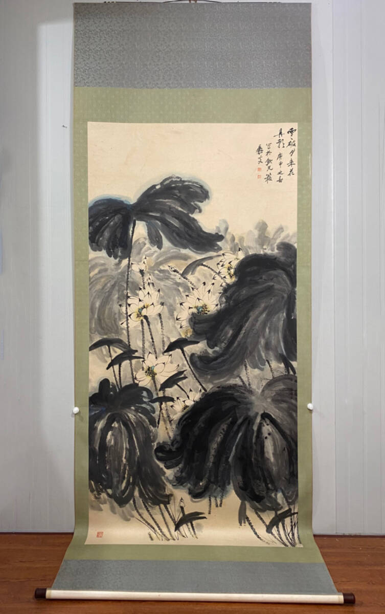 - 古美術 掛け軸 中国・近現代 「張大千書」 紙本 【荷韻図】 立軸 書道 巻き物 真筆逸品 肉筆保証 唐物 古画 LT-2409218