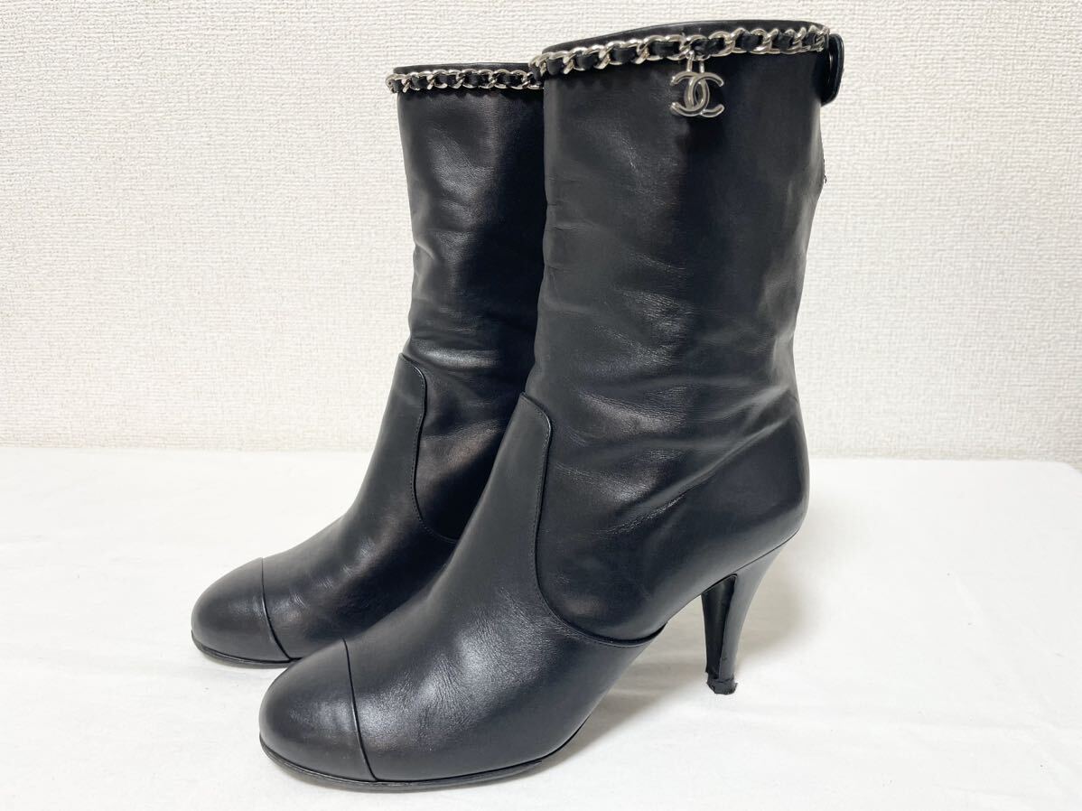 - 希少 美品 シャネル CHANEL G27249 CCロゴ ココマーク チャーム チェーン レザー ショート ブーツ ヒール 36 1/2 23~23.5㎝ レディース 黒