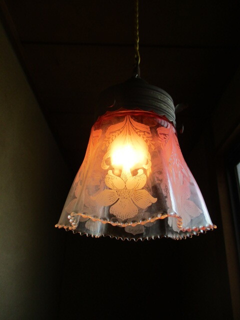 - ユリ花模様ピンクフリルガラス ホルダー付きランプシェード電笠フランス百合リリー古民家リフォームライト照明アンティーク ビンテージ