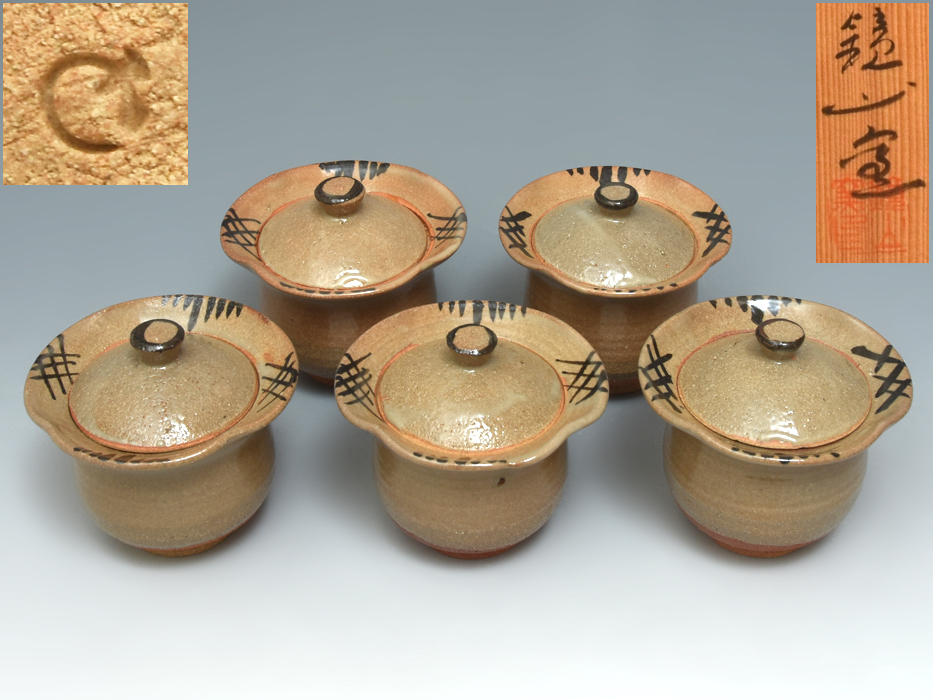 - 鏡山窯 絵唐津蓋物 5客揃い 共箱 蓋付 懐石道具 茶懐石 料理皿 和食器 向付 陶磁器 蒸し碗 茶碗蒸し z8276a