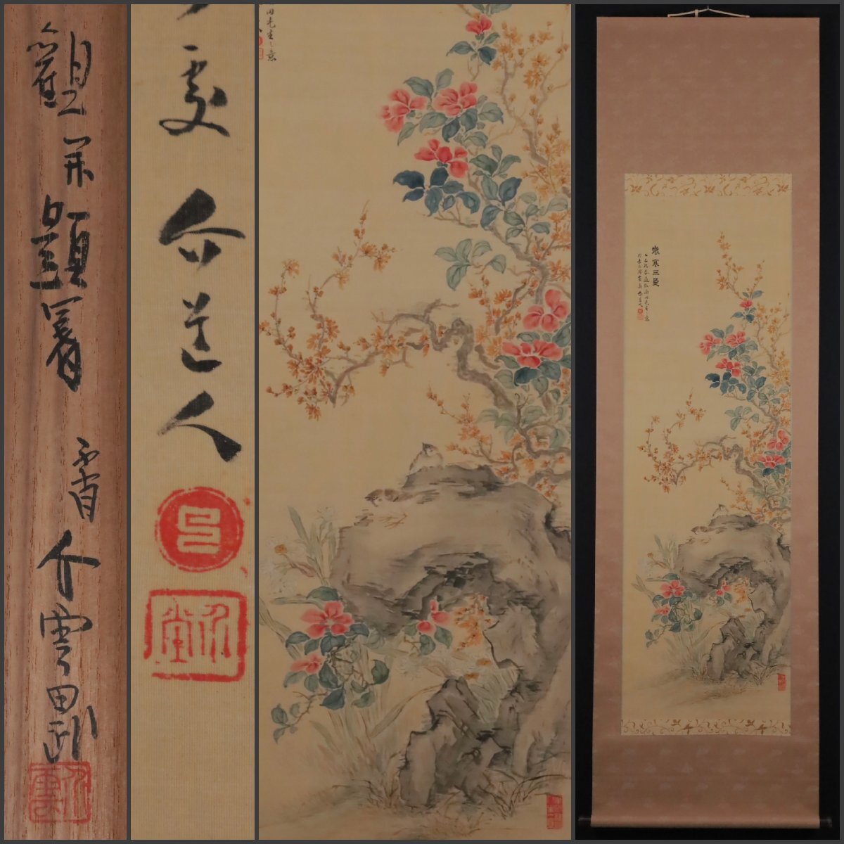 - 【模写】吉】11306 山田介堂 太湖石 花鳥図 倣南田 山田介雲極箱 富岡鉄斎,細谷立斎,平野五岳師事 筑前福岡県の人 南画家 茶掛け 茶道具 中