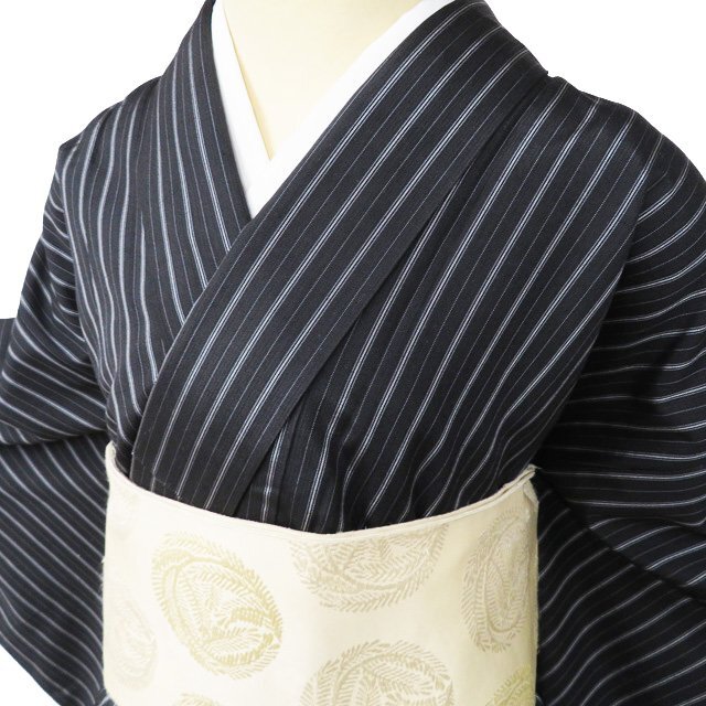 - 紬 着物 中古 正絹 袷 カジュアル 縦縞模様 黒色 多色 身丈159.5cm 裄66cm M きもの北條 A1091-6