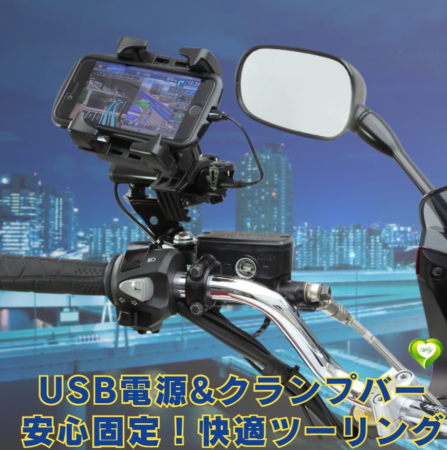 > 【安心固定!快適ツーリング】バイク用 USB電源&クランプバー ハリケーン(HURRICANE) 外径22.2mm 68mm ブラック 便利 充電 ツーリング