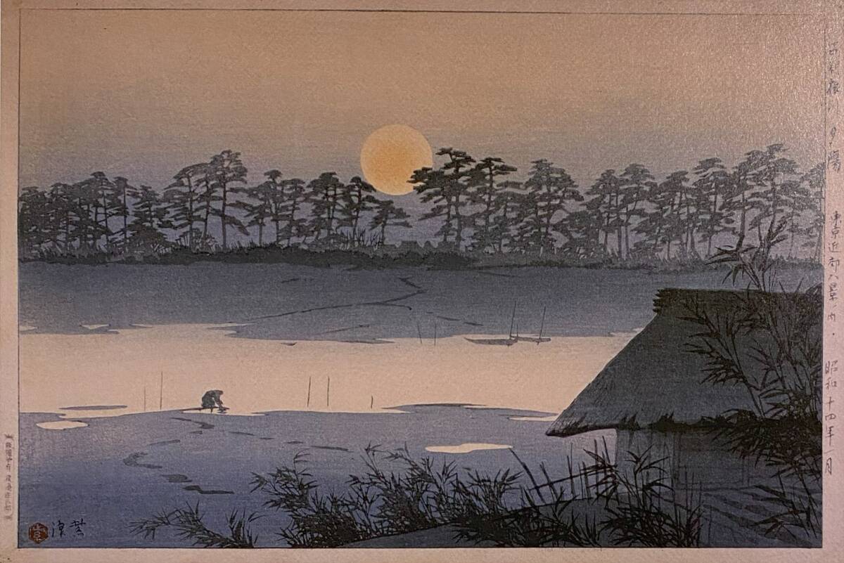 - 笠松紫浪、〈古利根川 夕陽〉、希少画集画、高級新品額・額装付、状態良好、送料込み