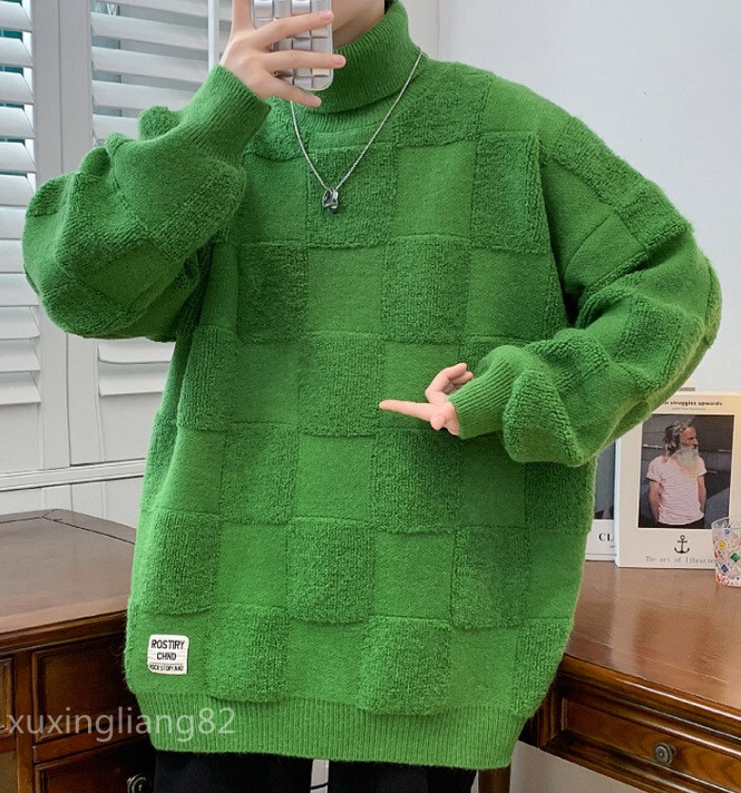 > 新品 お洒落 ニット セーター メンズ プルオーバー カットソー タートルネック 無地 チェック柄 カジュアル 緑/2XL