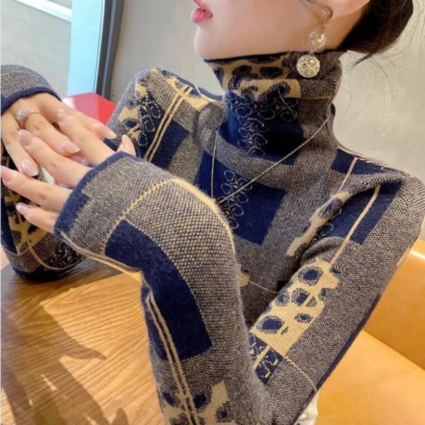 > 秋冬品*優雅 ニットトップス レディースきれいめ 長袖セーター ハイネック 韓国風 大人 プリント柄 着やせ 細身 ニットセーター*紺