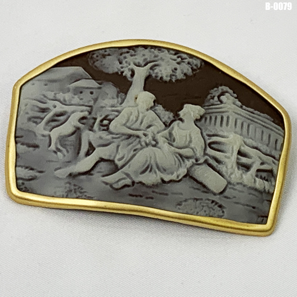 - 送料無料!! 木陰の休息 ドーム型 樹脂カメオ 犬 公園 ブローチ ペンダントトップ 兼用65.0×45.0mm ゴールド アンティーク調 ◇B-0079