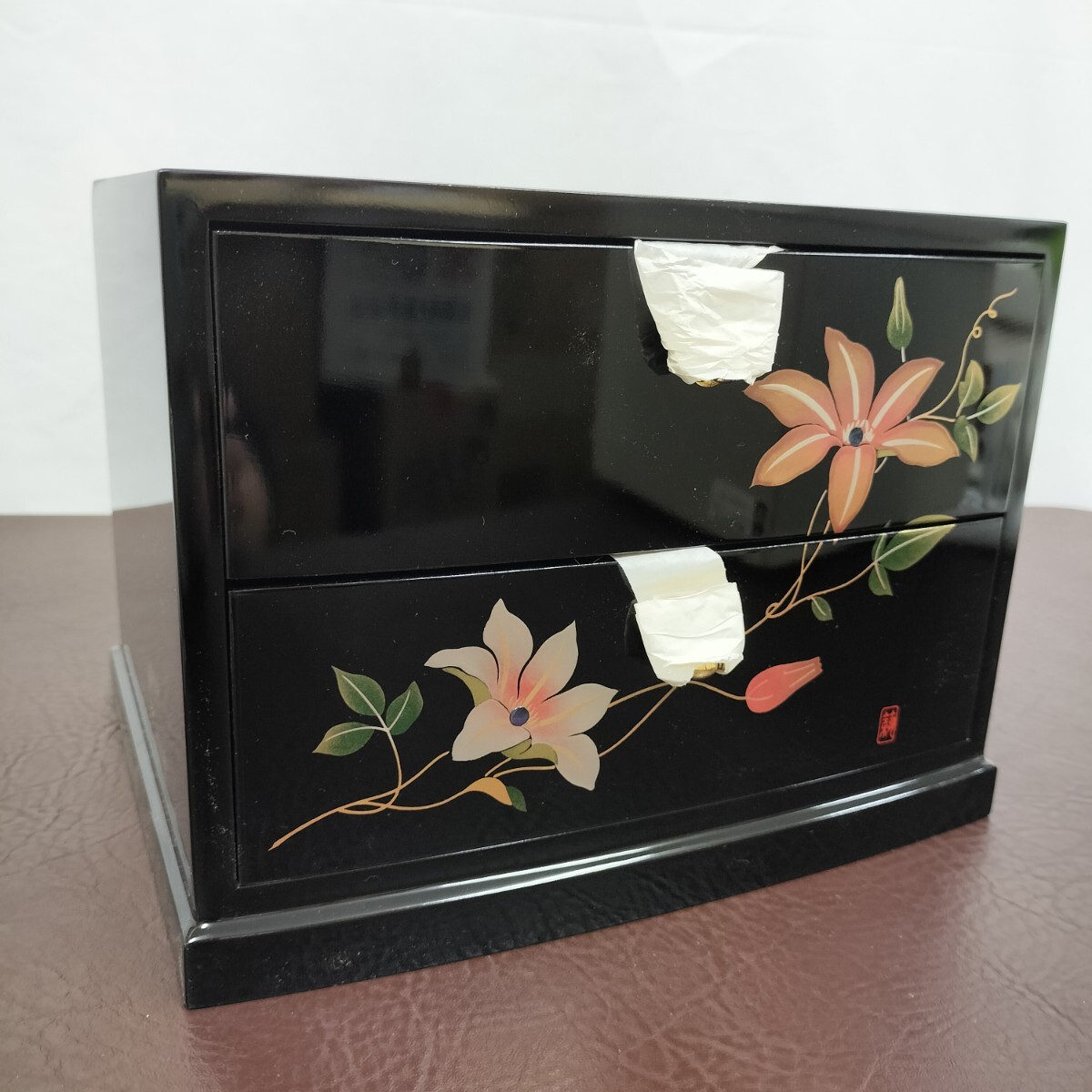 - 【未使用】曽根工芸 漆塗 クレマチス 二つ引出 木製 ニ段 小引き出し SONE KOGEI 柄 小物入れ 小箪笥 花模様 漆器 漆塗り 日本製 百貨店
