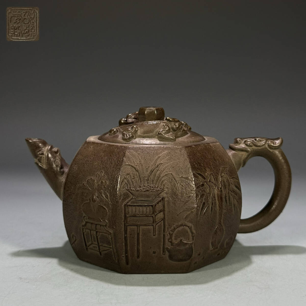 - 古陶芸 紫砂壷 清時代 【邵毓秀】製 「彩絵八面玲瓏壺」 段泥 煎茶 急須 茶道具 唐物 時代物 茶器 容量420cc LT-2410105