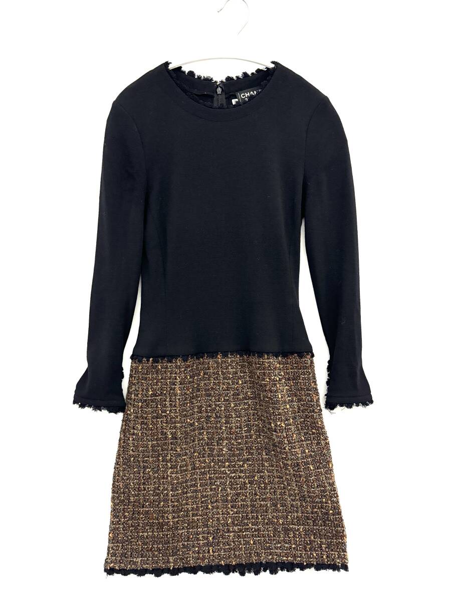- 6J1304【本物保証】シャネル ワンピース ツイード 切り替え ブラウン ブラック フリンジ ココマーク ボタン 36 vintage CHANEL