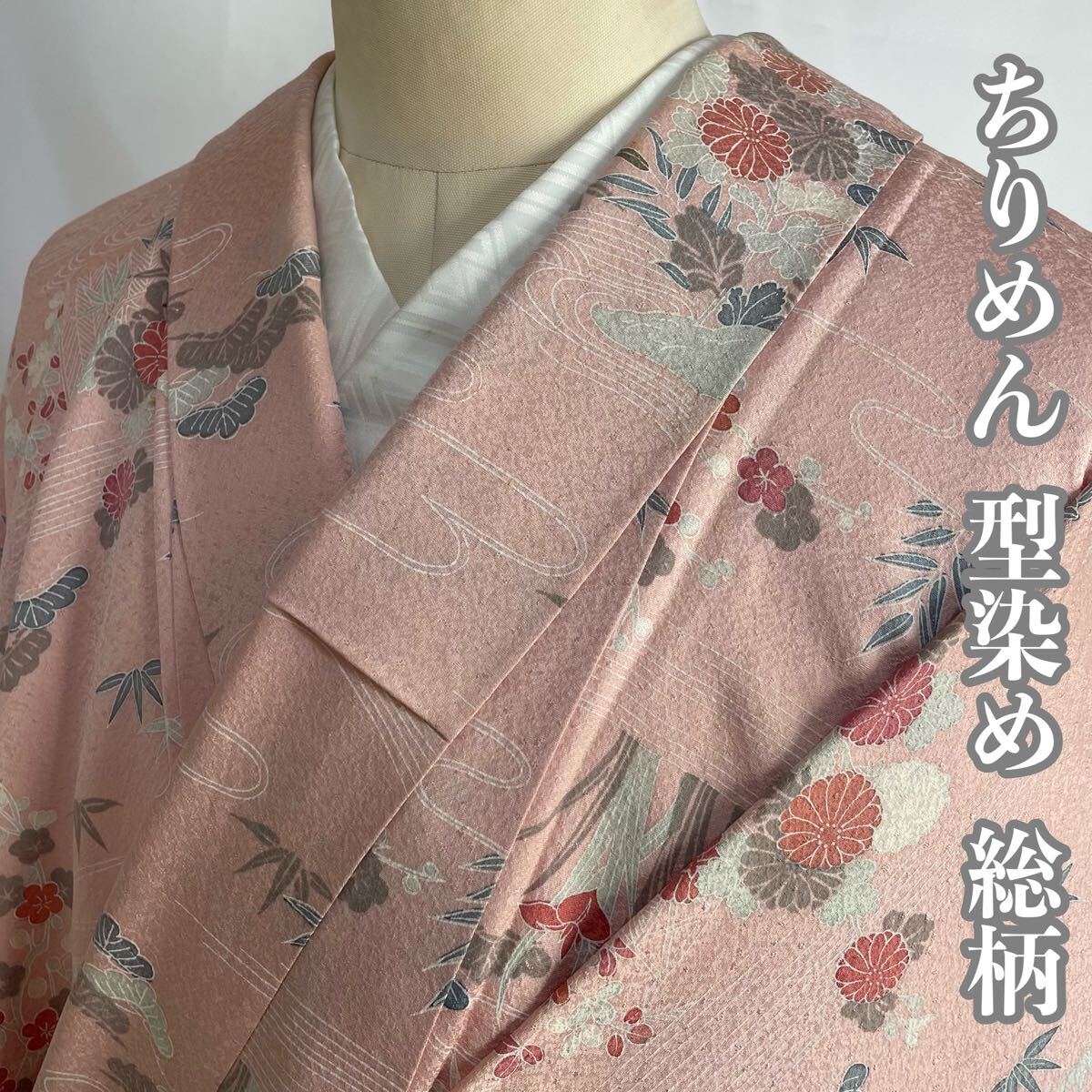 - #E013 1円スタート! 縮緬 ちりめん 型染め 総柄 菊 松 梅 花菖蒲 正絹 和装 和服 着物【wellriver】