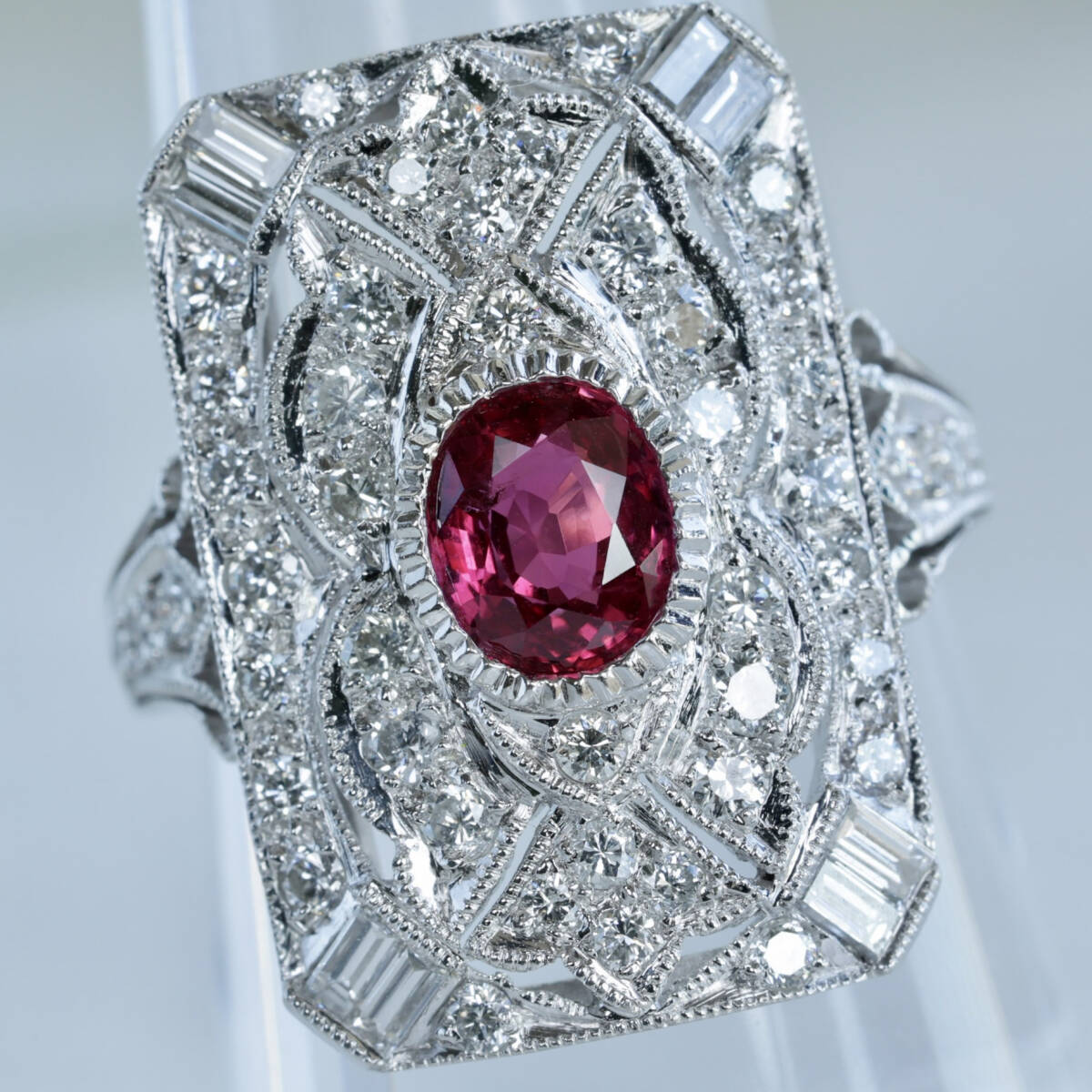 - Pt900 ルビー 0.77ct ダイヤモンド 0.91ct リング 透かし彫り プラチナ ミル打ち